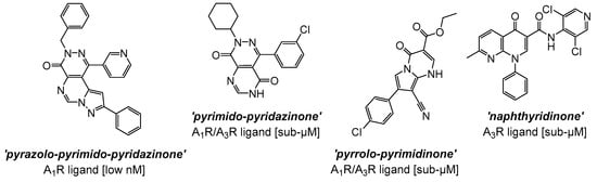 Subsequently, refinements of the tricyclic structures have been carried out on this series [140], via molecular simplifications strategies mainly focusing on (1) the removal of one aromatic/heterocyclic ring in the scaffold (a particular example being the pyrimido-pyridazinone A1R/A3R mixed analogue, where the elimination of the pyrazole ring i.e., a critical element for A1R activity in the tricyclic series, was performed; Figure 3) and, simultaneously, (2) the alteration of the pattern of nitrogen inclusion in the heterocyclic system (see, as examples, the pyrrolo-pyrimidinone A1R/A3R mixed antagonist and the naphthyridinone analogue, which is a preferentially selective A3R antagonist; Figure 3). [140]. Overall, SAR considerations on these series [98,99,100,101,136,137,138,140] suggest that both tricyclic and bicyclic fused core systems are capable of mimicking adenosine’s flat purine-like structure, thereby likely engaging in key hydrogen bonding and π-π interactions within the orthosteric binding site. Nonetheless, the removal of the pyrazole ring, or the simplification of the polyheterocyclic structure (i.e., from tricylic to bicyclic) result in generally lower activities, likely due to the reduced rigidity and/or extended planarity, loss of key hydrogen bonding and π-π interactions, which in turn may lead to a suboptimal fit in the binding pocket of the receptor.
