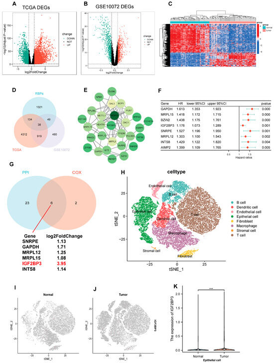 Differential expression analysis of RBPs was performed between LUAD and normal tissues. (A–C) Volcano and heatmap plots illustrate differentially expressed genes (DEGs) characterized. (D) Venn diagram illustrates the overlapping genes among RBPs, TCGA, and GSE10072 datasets. (E) The STRING database was used to create the PPI network. (F) Univariate Cox regression identified prognostic genes within the overlapping gene set. (G) The Venn diagram illustrates overlapping genes in PPI network nodes and univariate Cox regression analysis. (H) The t-SNE plot illustrates the distribution and annotation of distinct clusters. (I–K) Expression and distribution of IGF2BP3 in normal epithelial cells and tumor epithelial cells. *** p < 0.001.