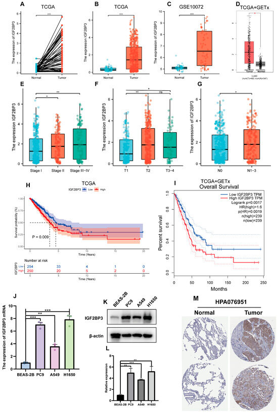 Association between IGF2BP3 expression and clinical features in LUAD. (A) IGF2BP3 levels were examined in paired normal and cancerous tissues from individual patients. (B–D) IGF2BP3 expression across all normal and tumor samples available. (E–G) IGF2BP3 expression in samples categorized according to tumor stage, T stage, lymph node metastasis status. (H,I) Kaplan–Meier curves were generated to assess survival differences between high- and low-IGF2BP3 expression groups, categorized by median levels. (J) IGF2BP3 mRNA levels in bronchial epithelium compared to LUAD lines. (K,L) IGF2BP3 protein levels were analyzed in bronchial epithelial cells and lung adenocarcinoma cell lines. (M) The expression of IGF2BP3 protein in LUAD tissues and normal lung tissues was evaluated by utilizing data from the Human Protein Atlas (HPA) database. (https://www.proteinatlas.org/, accessed on 30 May 2024). * p < 0.05, ** p < 0.01, *** p < 0.001; ns: not significant.
