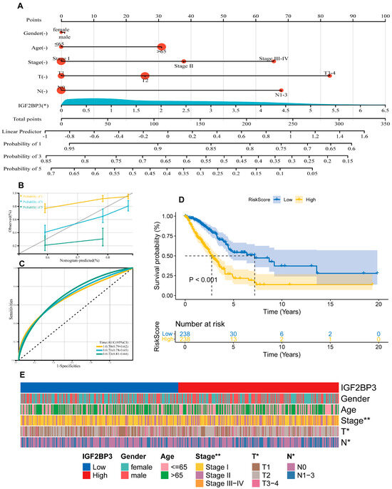 Prognostic modeling and the clinical value of IGF2BP3. (A) Development of a prognostic nomogram incorporating IGF2BP3 expression and multiple clinical variables. (B) Calibration curves assessing the prognostic model’s precision in estimating survival outcomes. (C) ROC curves depict the AUC for predicting overall survival rates at 1, 3, and 5 years for LUAD patients. (D) Kaplan–Meier analysis assessed survival differences between high-risk and low-risk patient groups, categorized based on the median RiskScore, with log-rank test indicating significant differences (p < 0.001). (E) Heatmap of clinical features. * p < 0.01, ** p < 0.01.
