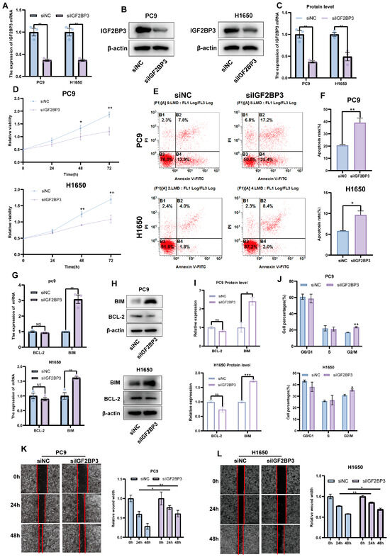 The downregulation of IGF2BP3 inhibits LUAD cell proliferation and promotes apoptosis. (A–C) IGF2BP3 siRNA transfection in PC9 and H1650 cells was followed by the assessment of IGF2BP3 mRNA and protein expression via qRT-PCR and Western blot. (D) Cell viability was evaluated following IGF2BP3 knockdown. (E,F) PC9 and H1650 cells transfected with IGF2BP3 siRNA were subjected to flow cytometry analysis to measure apoptosis. (G–I) Apoptosis-related genes’ BIM and BCL-2 expression levels were analyzed via qRT-PCR and Western blot following IGF2BP3 suppression. (J) PC9 and H1650 cells transfected with IGF2BP3 siRNA were analyzed by flow cytometry to assess cell cycle distribution. (K,L) Cell migration was assessed using wound-healing assays. * p < 0.05, ** p < 0.01, *** p < 0.001; ns, not significant.