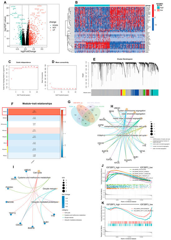 Enrichment analysis of DEGs in high- and low-IGF2BP3 groups. (A) Volcano plot illustrating differentially expressed genes in LUAD based on IGF2BP3 expression levels. (B) A heatmap illustrates differentially expressed genes (DEGs) in groups with high versus low IGF2BP3 expression. (C) The scale-free topology fit index was evaluated across multiple soft threshold powers (β). (D) Evaluation of mean connectivity across various soft threshold powers (β). (E) Hierarchical clustering dendrogram showing gene expression modules, with each color representing a distinct gene module. (F) The relationship between module eigengenes and IGF2BP3 expression was evaluated using Pearson correlation. (G) Venn diagram depicting the intersection of upregulated genes from TCGA, GSE10072, and DEGs linked to WGCNA. (H) Circos plot depicting Gene Ontology (GO) enrichment analysis of 20 DEGs, highlighting significantly enriched terms. (I) Circos plot of KEGG pathway enrichment analysis for 20 DEGs, with significantly enriched terms. (J) Gene set enrichment analysis (GSEA) showing enrichment of high-IGF2BP3-expressing samples in HALLMARK gene sets. (K) GSEA showing enrichment of low-IGF2BP3-expressing samples in HALLMARK gene sets.