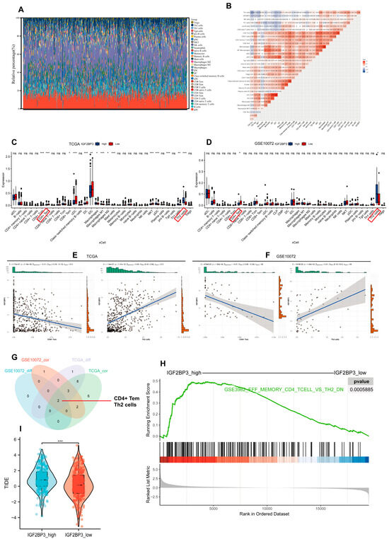 Association between IGF2BP3 and immune cell infiltration in LUAD. (A) Stacked bar graphs illustrating the proportions of 32 tumor-infiltrating immune cells in LUAD tumor samples. (B) Heatmap depicting the correlation between tumor-infiltrating lymphocytes and IGF2BP3 expression, where each color square represents the corresponding correlation value. (C,D) Box plots illustrate tumor-infiltrating immune cell distribution in LUAD samples, stratified by IGF2BP3 expression levels. The red box indicates the immune cell types that appear in both the TCGA and GSE10072 datasets and show significant differences. (E,F) Correlation analysis between IGF2BP3 expression and Th2 cells as well as CD4+ Tem cells. (G) Venn diagram displaying immune infiltration cells that exhibit differential expression and are associated with IGF2BP3. (H) GSEA results derived from the MSigDB database C7 collection. (I) TIDE scores for the high IGF2BP3 expression group. * p < 0.05, ** p < 0.01, *** p < 0.001; ns: not significant.