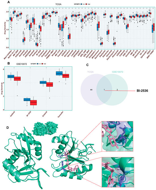 Analysis of drug sensitivity in LUAD patients with high and low IGF2BP3 expression. (A,B) Analysis of drug responsiveness in lung adenocarcinoma cases using TCGA and GSE75037 data. (C) Venn diagram displaying the overlap of drugs sensitive to IGF2BP3 between TCGA and GSE75037 datasets. (D) Molecular docking model of IGF2BP3 and BI-2536. ** p < 0.01, *** p < 0.001.