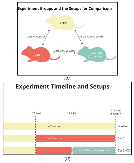 Experimental Design and Treatment Timeline for Mouse Comparisons: (A) Illustration of mouse treatments and the comparison groups; (B) Timeline diagram of the experiment comparing treatment (Gas6, Gas6-AXLi) and control groups.