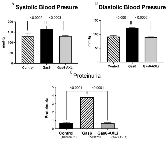 Blood Pressure and Proteinuria in Control and Treated Animals. A significant increase in both systolic and diastolic pressure was induced by Gas6 treatment but significantly decreased when AXL was inhibited (A,B). Gas6-induced proteinuria was reduced with AXL inhibition (C).