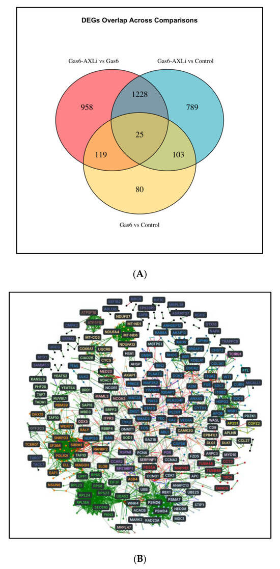 Preprocessing of the bulk RNA-sequencing reads was performed using the RASflow pipeline [23]. Briefly, this workflow carries out the following steps: quality control with FastQC (https://www.bioinformatics.babraham.ac.uk/projects/fastqc/, accessed on 3 July 2025), read trimming with TrimGalore (https://www.bioinformatics.babraham.ac.uk/projects/trim_galore/, accessed on 3 July 2025), read mapping and quantification with Salmon [24], mapping of transcripts to genes with tximport, and differential expression analysis with edgeR with negative binomial statistics (v4.6.2) [25] for the two conditions: (1) Gas6-AXLi vs. Gas6 and (2) Gas6-AXLi vs. Control. The list of statistically significantly differentially expressed genes (DEGs) was produced using an FDR-adjusted p-value < 0.05 as the threshold. The DEGs were mapped from Rattus norvegicus Ensembl IDs (RGSC3.4; rn4 release 52) to their corresponding human Ensembl IDs using Biomart.