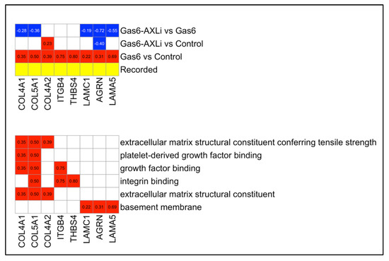 Several ECM-related genes were significantly upregulated following Gas6 treatment (Gas6 vs. Control) and subsequently downregulated with AXLi treatment (Gas6-AXLi vs. Gas6), suggesting a reversal of Gas6-induced transcriptional activation (Figure 5). These include LAMC1 (Gas6: 0.22, p = 0.032; AXLi: −0.19, p = 0.025), LAMA5 (0.69, p = 5.68 × 10−13; AXLi: −0.55, p = 1.36 × 10−7), AGRN (0.31, p = 0.01; AXLi: −0.72, p = 8.33 × 10−14), COL4A1 (0.35, p = 0.012; AXLi: −0.28, p = 0.01), and COL5A1 (0.50, p = 0.024; AXLi: −0.36, p = 0.025).
