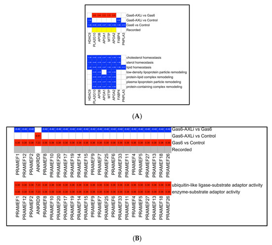 The GO analysis of downregulated genes revealed multiple lipid-associated biological processes, including lipid homeostasis, low-density lipoprotein particle remodeling, and protein–lipid complex remodeling (Figure 6A). Key lipid metabolism genes such as HDAC9 (−1.28, p = 0.024), PLA2G10 (−0.45, p = 0.033), APOB (−2.35, p = 0.038), APOA1 (−2.47, p = 7.53 × 10−4), MTTP (−2.47, p = 0.001), APOA2 (−2.39, p = 0.049), FABP4 (−0.01, p = 1 × 10−4), and PNPLA3 (−0.51, p = 0.026) were downregulated following Gas6 treatment when compared to the mock-treated control. After AXLi treatment, expression of most of these genes returned to control levels, except for HDAC9 (−1.28, p = 0.024), FABP4, and PNPLA3, which remained suppressed.