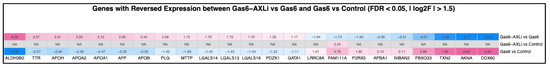 Genes with Reversed Expression between Gas6-AXLi vs. Gas6 vs. Control. The color gradient depicts the up (red) or down (blue) regulation of the genes. Only genes with direct reversal in regulation are included. (FDR < 0.05, |log2F| > 1.5).