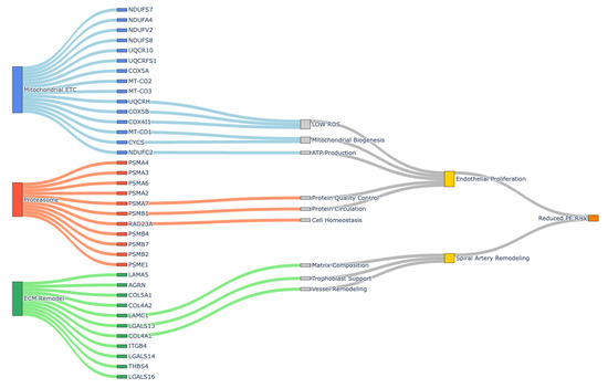 Other genes may relate to mitochondrial function, volume regulation, and innate immunity. LRRC8A, involved in cell volume control [48], shows increased placental activity during normal pregnancy, while FAM111A, which responds to DNA replication stress, has been implicated in placental pathology [49]. Recovery of TXN2, a mitochondrial thioredoxin, suggests a possible restoration of redox balance [50], and rescue of AKNA and DDX60 may reflect improved transcriptional and antiviral readiness in the placenta [51,52,53].