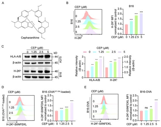 Cepharanthine (CEP), a bisbenzylisoquinoline alkaloid derived from Stephania japonica (Thunb.) Miers of the Menispermaceae family (Figure 1A), was investigated for its immunomodulatory effects on major histocompatibility complex class I (MHC-I) expression. Given the well-established role of MHC-I downregulation in tumor immune evasion [5,6], we assessed CEP’s ability to modulate MHC-I expression in melanoma models. Two cell lines were employed: human A375 cells expressing HLA-A/B and murine B16 cells expressing H-2Kb. Following 24 h of treatment with increasing concentrations of CEP (0, 1.25, 2.5, and 5 μM), flow cytometric analysis revealed a dose-dependent upregulation of surface MHC-I expression in B16 cells (Figure 1B). Consistently, Western blot analysis demonstrated elevated intracellular MHC-I protein levels in both A375 and B16 cells (Figure 1C). To determine the functional consequences of MHC-I upregulation, we employed two antigen presentation models: wild-type B16 cells pulsed with the OVA257–264 peptide and B16-OVA cells stably expressing ovalbumin. Flow cytometry showed that CEP treatment led to a dose-dependent increase in surface expression of the H-2Kb/SIINFEKL complex in both models (Figure 1D,E), indicating enhanced antigen presentation capacity. Together, these findings demonstrate that CEP enhances the antigen presentation machinery of melanoma cells by upregulating MHC-I expression at both the cell surface and total protein levels. This dual effect highlights CEP as a novel immuno-modulatory compound capable of boosting melanoma cell immunogenicity, thereby holding promise for enhancing the effectiveness of immune-based therapeutic approaches against melanoma.