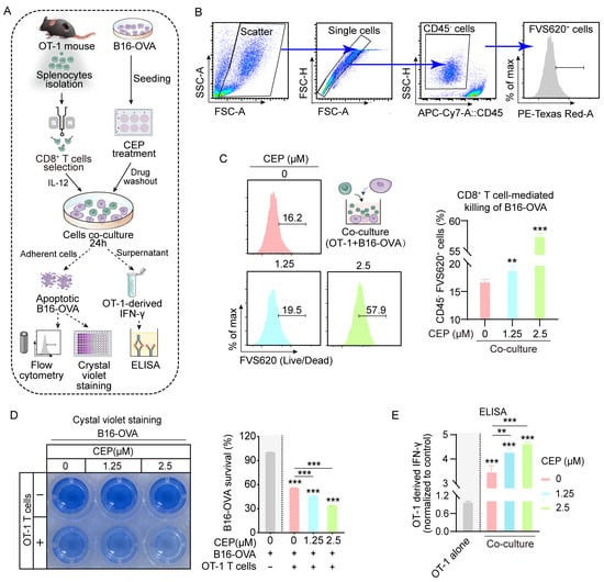 OT-1 transgenic mice (Strain #GAP2013), harboring a T cell receptor specifically recognizing the OVA257–264/H-2Kb antigen complex, were procured from GeneEasy Biotech (Yangzhou, China). Splenic cell suspensions were prepared through mechanical dissociation, followed by lymphocyte isolation using density gradient centrifugation (Cat# 7211011, Dakewe Biotech, Shenzhen, China). CD8+ T lymphocytes were purified through magnetic separation after incubation with anti-mouse CD8a MicroBeads (Cat# 130-117-044, Miltenyi Biotec) in MACS buffer (Cat# 130-091-222, Miltenyi Biotec, Bergisch Gladbach, Germany) at 4 °C for 10 min. The isolated CD8+ T cells were maintained in complete medium containing recombinant IL-2 (Cat# 212-12-100, PeproTech, Cranbury, NJ, USA) for subsequent functional analyses. To evaluate cytotoxic activity, CEP-treated B16-OVA tumor cells were incubated with OT-1-derived CD8+ T cells at a target-to-effector ratio of 10:1 for 24 h. Post-co-culture, cellular viability was determined by flow cytometry using CD45 surface staining combined with FVS620 viability dye. Flow cytometric analysis was used to assess tumor cell death by measuring the mean fluorescence intensity (MFI) of FVS620 within the CD45− tumor cell population. This gating strategy enabled the quantification of cell death as an indicator of CD8+ T cell cytotoxic activity against CEP-pretreated tumor cells. Relative FVS620 MFI values were compared across treatment conditions to evaluate the extent of CEP-enhanced, T cell-mediated cytotoxicity.