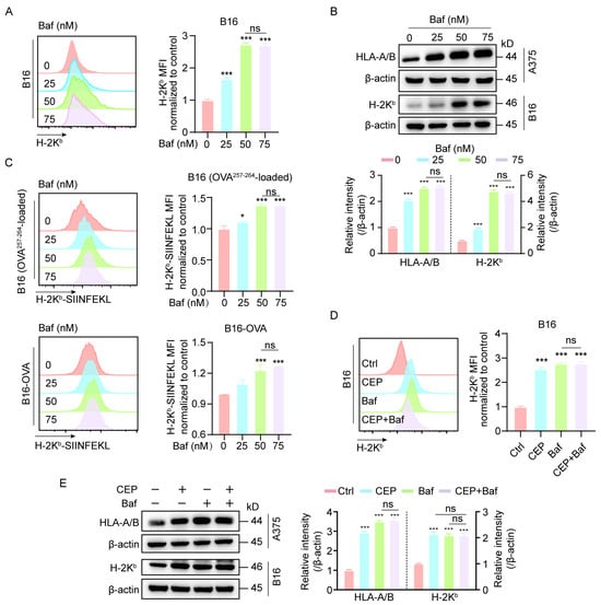 Our initial findings demonstrated that CEP treatment increases MHC-I expression in melanoma cells. Given the well-established role of autophagy in mediating MHC-I degradation, we further explored whether CEP exerts its immunomodulatory effects via autophagy inhibition. To this end, we employed Bafilomycin A1 (Baf), a classical autophagy inhibitor, as a pharmacological reference. B16 cells were exposed to increasing concentrations of Baf (0, 25, 50, and 75 nM) for 24 h. Flow cytometric analysis revealed a dose-dependent upregulation of surface MHC-I expression (Figure 3A). This elevation in antigen presentation machinery was further validated at the protein level through Western blot analysis, with both B16 and A375 cells exhibiting progressive increases in total MHC-I expression that correlated with Baf concentration (Figure 3B). In addition, Baf treatment led to a dose-dependent increase in the surface presentation of H-2Kb/SIINFEKL complexes, as detected by flow cytometry (Figure 3C), indicating enhanced antigen presentation. To determine whether CEP and Baf act through similar pathways, we performed combination treatment experiments. The results showed non-additive effects on MHC-I expression (Figure 3D,E), suggesting that CEP and Baf share a common mechanism—namely, autophagy blockade—to enhance MHC-I-mediated antigen presentation in melanoma cells.