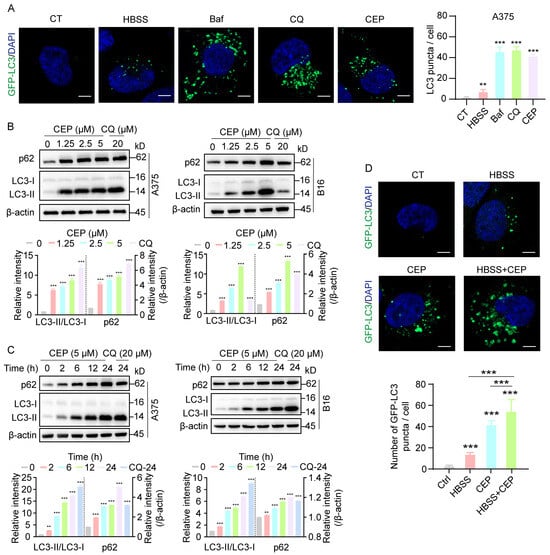 To investigate the impact of CEP on autophagic dynamics, we utilized A375-GFP-LC3 melanoma cells to visualize autophagosome formation in real time via fluorescence-based tracking. To delineate the underlying mechanism, we included parallel control groups treated with HBSS (a classical autophagy inducer), as well as chloroquine (CQ) and bafilomycin A1 (Baf), both well-established autophagy inhibitors. Confocal microscopy analysis revealed a marked increase in GFP-LC3 puncta formation in cells treated with HBSS, Baf, CQ, or CEP, compared to vehicle-treated controls (Figure 4A), indicating substantial autophagosome accumulation. Notably, CEP induced autophagosome accumulation to a similar extent as CQ and Baf, suggesting a comparable inhibitory effect on autophagic flux. To further validate this observation, we examined the expression of canonical autophagy markers LC3-II and p62, whose co-accumulation is indicative of blocked autophagic degradation [24]. Western blot analysis demonstrated progressive accumulation of LC3-II and p62 in both A375 and B16 cells upon exposure to escalating doses of CEP (Figure 4B). Time-course analysis revealed that this effect was progressively amplified over 24 h (Figure 4C), further supporting sustained inhibition of autophagic flux. Strikingly, co-treatment with CEP and HBSS resulted in a synergistic enhancement of autophagosome accumulation (Figure 4D), reinforcing the conclusion that CEP acts as an inhibitor of autophagic degradation, rather than merely an inducer of autophagosome formation. Together, these findings demonstrate that CEP inhibits autophagy in melanoma cells, leading to the accumulation of autophagic vesicles, which likely contributes to its immunomodulatory effects via stabilization of MHC-I molecules.