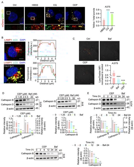Autophagy is a highly conserved intracellular degradation process that maintains cellular homeostasis under stress conditions [25]. During autophagy initiation, stimuli such as nutrient deprivation or oxidative stress promote autophagosome formation, which subsequently fuses with lysosomes to form autolysosomes. Within autolysosomes, lysosomal acid hydrolases (e.g., cathepsins) degrade the engulfed contents, releasing small molecules such as amino acids and free fatty acids for cellular recycling. To elucidate the precise mechanism by which CEP impairs autophagic flux, we first established an A375-mCherry-GFP-LC3 dual-fluorescent reporter cell line, which enables real-time discrimination between autophagosomes (yellow fluorescence) and autolysosomes (red fluorescence only). Confocal microscopy revealed that, similar to chloroquine (CQ) treatment, CEP exposure resulted in persistent yellow puncta due to the retention of GFP fluorescence (Figure 5A), suggesting impaired autophagosome–lysosome fusion or lysosomal acidification.
