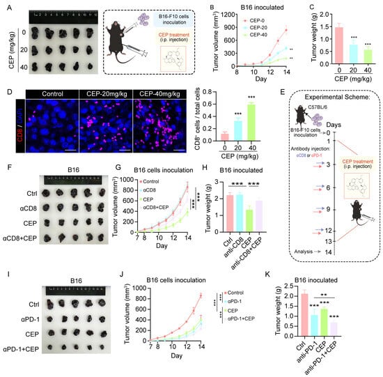 All procedures involving animals were performed in compliance with the ethical standards approved by the Institutional Animal Care and Use Committee (IACUC) at Guangzhou University of Chinese Medicine (Approval No. 20240528002). Male C57BL/6 mice (8 weeks old, SPF-grade), obtained from Guangdong Provincial Medical Laboratory Animal Center, were maintained in a regulated environment with ad libitum access to autoclaved feed and water. For tumor induction, each mouse received a subcutaneous injection of 2 × 106 B16 melanoma cells (in 100 μL PBS) into the right flank region. Treatment protocols were initiated 24 h after tumor inoculation. Mice were then randomly assigned to one of three treatment groups (n = 5 per group): vehicle control (saline), CEP at 20 mg/kg, and CEP at 40 mg/kg. All treatments were administered once daily via intraperitoneal injection (i.p.). To investigate the mechanistic role of CD8+ T cells, an additional set of mice were assigned to four experimental groups: Control, Anti-CD8 antibody (αCD8; 200 μg/mouse, i.p. every 72 h), CEP alone (40 mg/kg, i.p. daily), and CEP + αCD8 combination therapy. In parallel, the synergistic effect of PD-1 blockade was evaluated using the following treatment groups: Control, Anti–PD-1 antibody (αPD-1; 200 μg/mouse, i.p. every 72 h), CEP alone (40 mg/kg, i.p. daily), and CEP + αPD-1 combination therapy. Mice were monitored until tumor volumes approached the humane endpoint (~800 mm3), at which point they were euthanized, and tumors were excised, weighed, and analyzed.