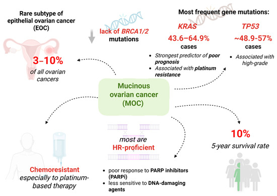 Key molecular and clinical features of mucinous ovarian cancer (MOC); 5-year survival rate—a statistical measure used in medicine to indicate the percentage of people who are still alive five years after being diagnosed with a particular disease; HR—low homologous recombinationCreated in BioRender. Łapińska, Z. (2025) https://BioRender.com/6fbh3ik.