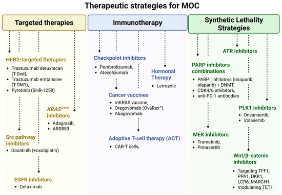Nevertheless, more research is needed to find effective treatment options for MOCs. Studies should focus specifically on patients diagnosed with this OC subtype and be conducted on a large group. Table 1 below provides an overview of therapeutic approaches, including their molecular targets, representative agents, current clinical evidence, and associated comments or limitations.