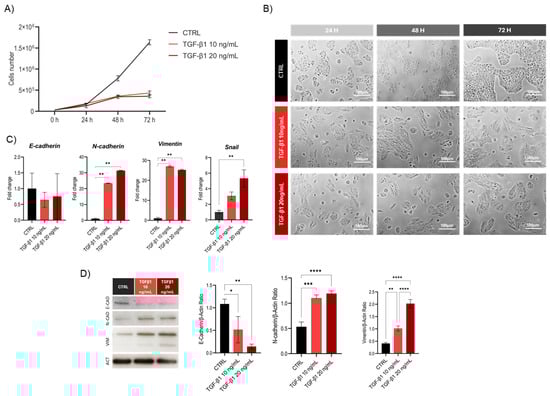 Cells were treated with 10 ng/mL and 20 ng/mL TGF-β1 for 72 h. Following treatment, a clear reduction in cell proliferation was observed starting at 48 h of TGF-β1 exposure compared to the control for both concentrations, as shown in Figure 1A. However, no significant differences were detected between the two treatment concentrations, suggesting that the reduction in cell proliferation does not follow a dose-dependent trend within this range. This data is also strengthened by the microscopic analyses of cell morphology; in fact, as shown in Figure 1B, treated cells exhibit an altered structure, appearing more elongated and less compact compared to controls. These morphological changes are consistent with the acquisition of a mesenchymal phenotype, which appears to correlate with both duration and concentration of the inducing cytokine exposure.
