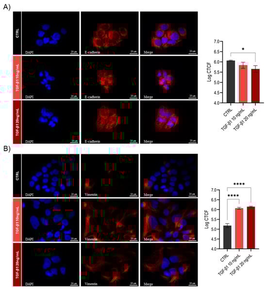 The immunohistochemical images of the transition model highlighted the intracellular localization of the analyzed markers and revealed morphological changes associated with the transition process. In particular, E-cadherin signal intensity showed a significant reduction (p < 0.05) at the highest TGF-β1 concentration. Additionally, in the TGF-β1-treated cells, its subcellular localization appeared more diffuse and less distinctly membrane-associated compared to controls (Figure 2A). As for vimentin, the images confirm the significant increase observed at both the gene and protein levels (Figure 1C,D), further highlighting how the cytoskeletal structure of the cell appears more elongated and branched, typical of a mesenchymal phenotype (Figure 2B).