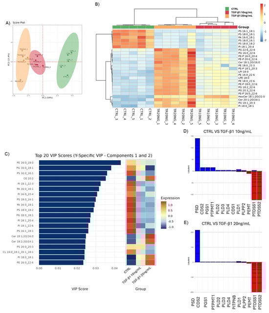 Lipidomic analysis of Huh7-induced EMT. Principal Component Analysis (PCA) score plot (A), hierarchical clustering heatmap (B), Variable Importance in Projection (VIP) scores from PLS-DA with corresponding expression heatmap (C), gene involvement plot showing t-scores of significant lipid transformations, comparing CTRL vs. TGF-β1 10 ng/mL (D) and CTRL vs. TGF-β1 20 ng/mL (E). In (B), the color scale represents the relative lipid abundance (log2 fold change), ranging from blue (lower expression) to red (higher expression). In (C), the heatmap shows lipid expression levels across groups, with colors from blue (low) to red (high) expression.