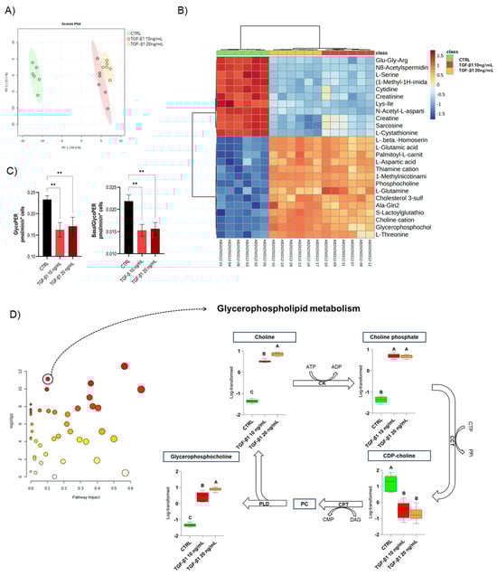An untargeted metabolomic analysis was also performed to complete the analytical framework of the in vitro model, which highlighted a significant reorganization of the cellular metabolic profile in response to TGF-β1 treatment that involved 122 annotated compounds, which were characterized through MetaboAnalyst (Figure 4).