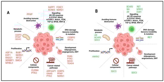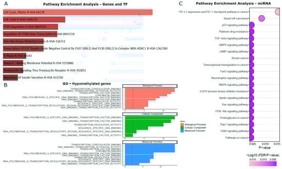 3.4. Identified Hallmark Gene Set Process Categories of the Hypo and Hypermethylated Probe–Gene Pairs, TFs, and miRNAs