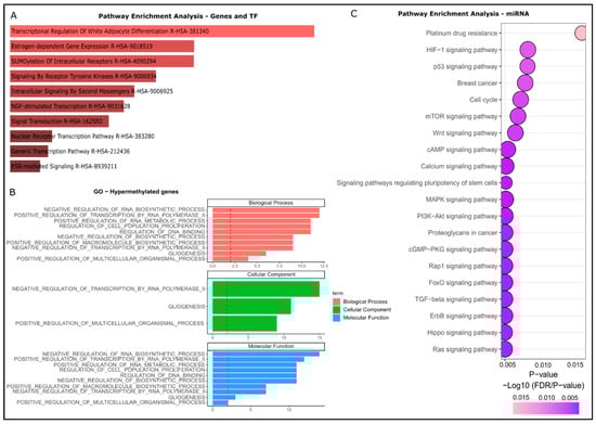3.3. Identified Signaling Pathways and Gene Ontology Terms of the Hypo and Hypermethylated Probe–Gene Pairs, TFs, and miRNAs