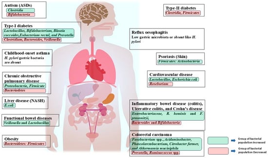 There is a wide diversity of bacteria in our foregut and midgut, which is regulated by our dietary habits. An equilibrium of different types of bacteria generally benefits human health, while disequilibrium may lead to more severe health problems [,,,,,,,,]. The commonly found species of bacteria in the human gut include Firmicutes, Actinobacteria, Bacteroidetes, Verrucomicrobia, and Proteobacteria [,,,,].