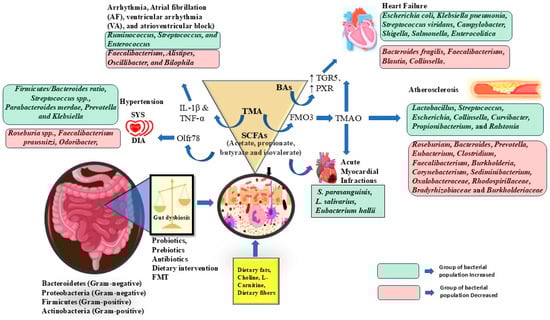 HF is a disease in which heart blood pumping efficiency is reduced and does not supply sufficient blood and oxygen as per the body’s needs. Many factors contribute to HF, and gut microbiota is one of them. It involves regulating the immune and inflammatory responses that favor the HF pathophysiological mechanisms []. Gut dysbiosis involves reduced cardiac efficiency and raised systemic congestion that leads to ischemia and edema of the intestine mucosa, improves bacterial translocation, and increases circulating lipopolysaccharide levels (endotoxins), which play a role in the underlying inflammation in HF patients [,,]. Moreover, Clostridium difficile infection is reported in the HF patients. Furthermore, the sequencing data of microbial diversity of fecal samples of HF patients showed a diminution of many butyrate-producing bacteria and Dorea longicatena and Eubacterium rectale. However, pathogenic Campylobacter, Shigella, and Salmonella bacteria are abundant []. In addition, based on metagenomics and metabolomics data, it is shown that some HF patients reported a significant decrease in Blautia, Collinsella, and Faecalibacterium prausnitzii [,]. Paisini et al. (2016) [] study shows that chronic heart failure patients have higher intestinal permeability and a higher number of gut bacteria (in feces) than control individuals []. Different animal studies have demonstrated the richness of different types of fecal flora in HF animals. This indicates that HF may cause the dysbiosis of gut microflora that supports the progression of the disease []. TMAO is a microbiota-associated metabolite, and few studies have demonstrated that increased levels of circulating TMAO are predictors of acute and chronic heart patients compared to healthy controls []. This metabolite is also associated with other CVDs like left ventricular dilatation, myocardial fibrosis, ventricular remodeling, and cardiac hypertrophy [].