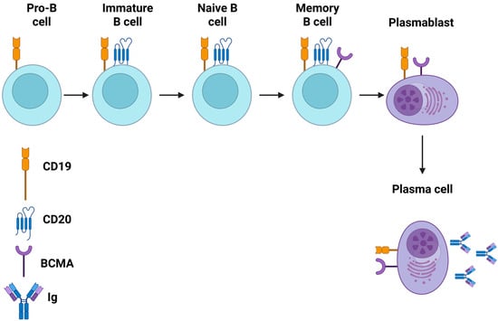 CD19 is a glycoprotein that has a substantial role in the enhancement of signaling via the B cell receptor (BCR) and, thus, affects several functions of B cells, including their differentiation, secretion, and production of antibodies and memory development [48]. Additionally, CD19 is associated with CD21 and CD81, forming a multimolecular signaling complex, while its expression varies on the B cell’s subtype and activation status [49]. It has been shown that CD19 is highly expressed on mature and memory B cells, as well as plasmablast cells producing antibodies, and is also identified on specific pre-B and plasma cells, mainly those lacking the expression of the CD20 molecule [50]. CD19 as an activator of phosphoinositide 3-kinase (PI3K) acts as a signaling-activating molecule, essential for the proliferation and survival of normal, autoreactive, and neoplastic B cells [51].
