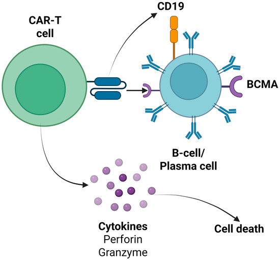 Based on the pathogenic role of BCMA via the activation of B cells in several autoimmune rheumatic disorders and the success of anti-BCMA CAR-T products in MM, various clinical trials are ongoing examining the safety and efficacy of these products in this field (Supplementary Materials, Table S2) [77].