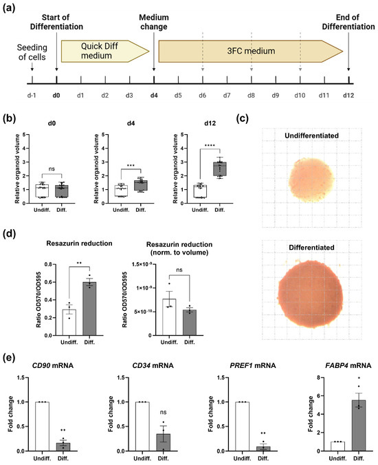 SGBS organoid model. (a) Overview of SGBS differentiation in low-attachment plates. After adipogenic induction (until d4), the medium was replaced every second or third day as indicated by dashed arrows. (b) Normalized organoid volume at selected time points. Individual organoids derived from n = 3 biological replicates were measured. Unpaired two-tailed t-test. (c) Oil Red-O staining of undifferentiated and differentiated organoids. Representative result of n = 3 experiments. Grid: 100 µm. (d) Resazurin reduction assay. Values are presented as mean ± SEM of n = 3 experiments. (Left panel): raw data; (right panel): normalization to organoid volume. The loss of a statistical difference between both groups using normalized data indicates that the observed effect (i.e., redox capacity) is due to cell intrinsic properties rather than an increased volume of differentiated organoids. Unpaired two-tailed t-test. (e) RT-qPCR analysis of stem cell- and pre-adipocyte markers of isolated nuclei derived from SGBS organoids. SGBS organoids were generated as outlined above followed by the isolation of nuclei to remove intracellular triglycerides that might interfere with gene expression analysis. Values are presented as mean ± SEM of n = 3 biological replicates. One-sample t-test. Spearman correlation was used to analyze various parameters in clinical samples. p values ≤ 0.05 were considered to be significant as indicated: * = p < 0.05; ** = p < 0.01; *** = p < 0.001; **** = p < 0.0001; ns: non-significant.