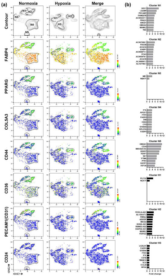 To analyze SGBS organoids in more detail and to investigate the response to oxygen deprivation, SGBS organoids on d12 (Figure 1a) were exposed to hypoxia (3% O2) for 24 h or maintained at normoxia for comparison (Supplementary Figure S2a). Isolated nuclei stained predominantly positive for DAPI and Lamin A/C as determined by flow cytometry (Supplementary Figure S2b,c) and were subjected to snRNA-seq analysis (Supplementary Figure S3). In normoxia, five distinct clusters (i.e., sub-populations) were identified (designated as N1-5), whereas in hypoxia, only three clusters were detected (designated as H1-H3) (Figure 2a). Specific marker genes were highlighted according to published literature [43,44] (Figure 2a). Successful differentiation of SGBS cells into adipocytes was confirmed again by the appearance of a FABP4+ population, respectively (i.e., cluster N4 and H3) (Figure 2a). Next, the gene expression pattern of each cluster was compared to all clusters within the same experimental condition (either normoxia or hypoxia) and differential expressed genes (DEGs) were analyzed (Figure 2b). Subsequently, the upregulated gene sets of various clusters were matched (Supplementary Figure S3b,c). Based on DEG analysis and the expression of well-defined signature genes [43,44] (Figure 2), clusters were manually annotated (Figure 3a). Intriguingly, clusters N3 and H1 showed a transcriptional shutdown (Figure 2b), which is a hallmark of dying cells [47], whereas NEAT1 (Figure 2b), a long-noncoding RNA associated with ferroptosis [48], was expressed. Further analysis of ferroptosis-associated genes (i.e., GPX4, ACSL4, LPCAT3, NEAT1, SLC39A14 [48,49,50,51]) revealed a heterogeneous expression pattern among clusters and conditions (i.e., normoxia and hypoxia) (Supplementary Figure S4). In conclusion, these findings might imply ferroptosis to take place in SGBS organoids in general.