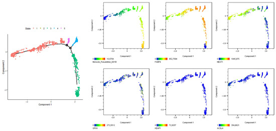 Analysis of ferroptosis-related factors in SGBS organoids. Pseudotime-trajectory analysis of normoxic SGBS organoids (corresponding to Figure 2 and Figure 3). (Left panel): identified stages by the Monocle algorithm. (Right panel), first row: Monocle pseudotime, FABP4 trajectory, NEAT1 trajectory; right panel, second row: GPX4 trajectory, KEAP1 trajectory, ACSL4 trajectory.