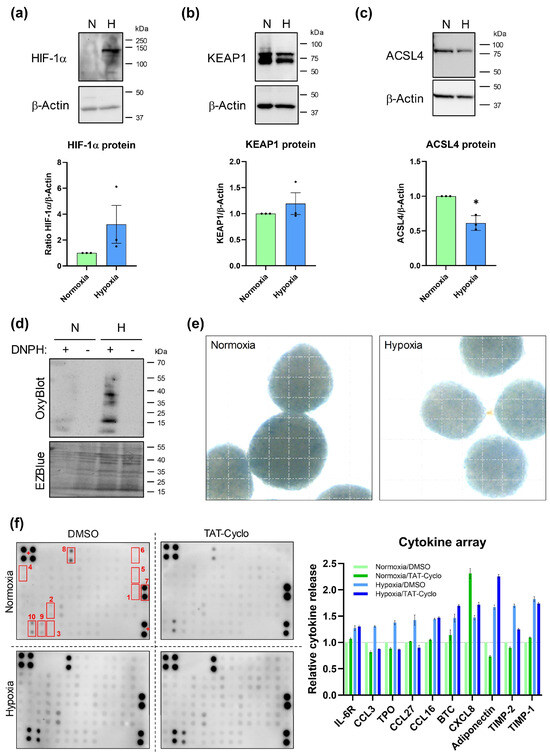 Effects of hypoxia in SGBS organoids. (a–c) Western blot analysis of normoxic (N) and hypoxic (H) SGBS organoids. n = 3; one-sample t test. (d) Analysis of protein oxidation by OxyBlot. A representative result of n = 3 independent experiments is shown. The DNPH substrate was added (+) or omitted (−) to confirm signal specificity. PVDF membrane was counterstained with EZBlue. (e) SA β-Gal staining of SGBS organoids. Grid: 100 µm. (f) Cytokine array. Cell culture supernatants of normoxic and hypoxic SGBS organoids of n = 3 experiments were pooled and subjected to cytokine measurement. TAT-Cyclo was used to inhibit HIF-1α. Top ten hypoxia-induced cytokines are indicated: (1) IL-6R, (2) CCL3, (3) TPO, (4) CCL27, (5) CCL16, (6) BTC, (7) CXCL8, (8) Adiponectin, (9) TIMP-2 and (10) TIMP-1. (+) Array positive control. Spearman correlation was used to analyze various parameters in clinical samples. p values ≤ 0.05 were considered to be significant as indicated: * = p < 0.05.
