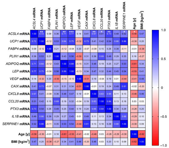 Spearman correlation matrix of gene expression measured in EAT (whole tissue; n = 16) as indicated. Correlation coefficients (r) are given. Statistical significance is only shown for ACSL4 mRNA for clarity. Spearman correlation was used to analyze various parameters in clinical samples. p values ≤ 0.05 were considered to be significant as indicated: * = p < 0.05; ** = p < 0.01; *** = p < 0.001.