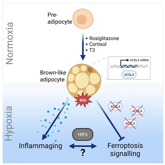 Our study reveals that the capability to undergo ACSL4-mediated ferroptosis of adipocytes is linked to brown-like adipogenesis. This implies the possibility to modulate ferroptosis by soluble factors affecting browning, putatively by PPARγ agonists and antagonists in adipose tissue. Our results demonstrate an inhibitory effect of hypoxia on ACSL4 that is accompanied by inflammaging (Figure 9). Whether there is a bi-directional relationship between both processes needs to be determined by future studies.