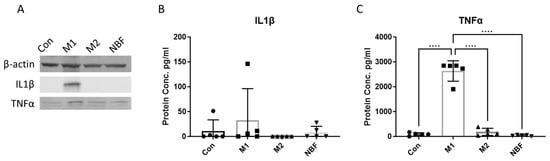 The protein expression of pro-inflammatory cytokines. (A). The western results of the expression of IL1β and TNFα among Con, M1, M2, and NBF conditions in cell lysates (B). The ELISA results of the comparison of IL1β level among Con, M1, M2, and NBF conditions in cell culture supernatants. (C). The ELISA results of comparison of TNFα level among Con, M1, M2, and NBF conditions in cell culture supernatants. (****: p < 0.0001).