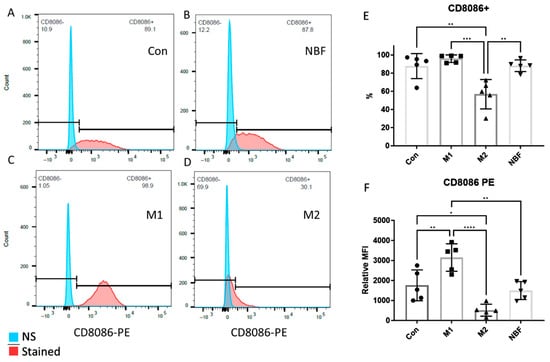 The FACS results of the cell surface marker CD8086. (A–D). Histograms of the CD8086 signal density of Con, NBF, M1, and M2 vs. non-stained (NS) sample. (E). The comparison of the percentages of the CD8086 positive cells among Con, M1, M2, and NBF conditions. (F). The relative median fluorescence intensity (MFI) comparison among Con, M1, M2, and NBF conditions. (*: p < 0.05, **: p < 0.01, ***: p < 0.001, ****: p < 0.0001)).