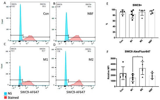 The FACS results of the cell surface marker SWC9. (A–D). Histograms of the SWC9 signal density of Con, NBF, M1, and M2 vs. non-stained (NS) sample. (E). The comparison of the percentages of the SWC9 positive cells among Con, M1, M2, and NBF conditions. (F). The relative median fluorescence intensity (MFI) comparison among Con, M1, M2, and NBF conditions (*: p < 0.05).