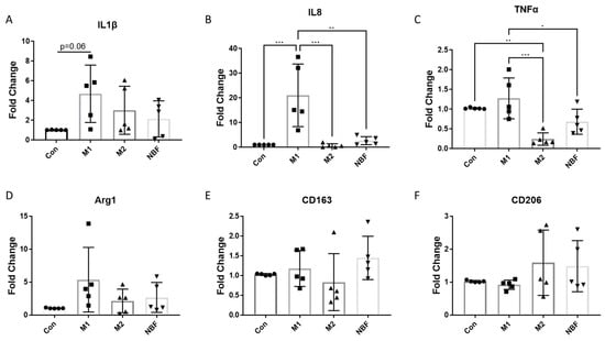 We compared the mRNA expression of multiple pro- and anti-inflammatory markers among the Con, M1, M2, and NBF conditions. The expressions of pro-inflammatory cytokines IL1β (p = 0.06) and IL8 (p = 0.0008) were significantly increased with the M1 condition compared to the Con condition (Figure 4A,B). The expressions of IL8 and TNFα were significantly higher in the M1 condition compared to the M2 (IL8: p = 0.0006 and TNFα: p = 0.0005) and NBF (IL8: p = 0.0017 and TNFα: p = 0.040) conditions (Figure 4B,C). The expression of TNFα was significantly decreased with the M2 condition compared to the Con condition (p = 0.0060) (Figure 4C). However, we did not observe any significant changes in anti-inflammatory gene expression (Arg1, CD163, CD206) among the 4 conditions (Figure 4D,E). These results showed that the pro-inflammatory markers were significantly induced by the M1 condition and not by the other conditions. Interestingly, NBF did not induce pro-inflammatory gene expression.
