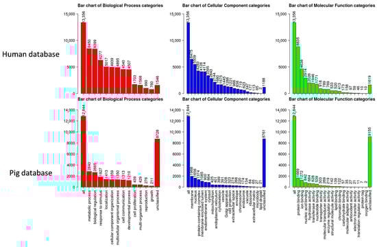 GO Slim summary figures used human database (top panel) and pig database (bottom panel).