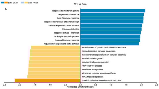 The amount of 3 µg of total RNA of each sample was also submitted to the Next Generation Sequencing Core at UTSW for bulk RNA sequencing (RNAseq). RNA integrity and quality was measured by Agilent BioAnalyzer 2100 (Agilent Technologies, Santa Clara, CA, USA), the RNA integrity number (RIN) of all samples were close and above 8.0 (Figure S2). A total of 12 libraries (4 groups, n = 3) were prepared and sequenced in paired-end mode (150 PE) with the depth of 35–45 M reads per sample (Illumina, San Diego, CA, USA). The differentially expressed gene (DEG) was performed using edgeR [36], and identified between the M1 vs. Con, M2 vs. Con, and NBF vs. Con. Gene Set Enrichment Analyses (GSEA) were performed using the WebGestalt website [37,38]. The DEGs and their rank scores (ranked based on the sign of fold change and the number of p-values) were input into the WebGestalt. Both human and porcine gene ontology (GO) databases were applied to annotate the DEGs. We further analyzed the top 500 DEGs (based on p-value and all p < 0.05) of each pair using Metascape website [39], which integrated multiple databases to annotate genes and perform pathway enrichment and network analyses.