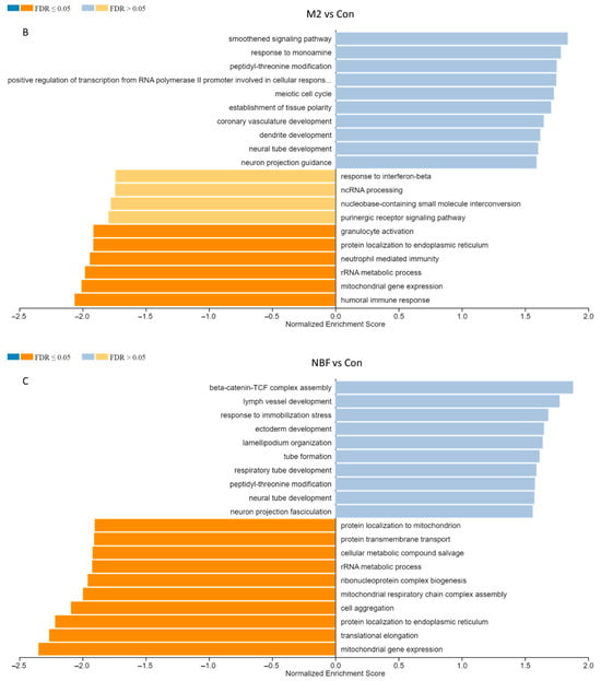 Gene Set Enrichment Analysis (GSEA) of the bulk RNA sequencing results. (A). M1 vs. Control (Con) conditions. (B). M2 vs. Con conditions. (C). NBF vs. Con treated conditions.