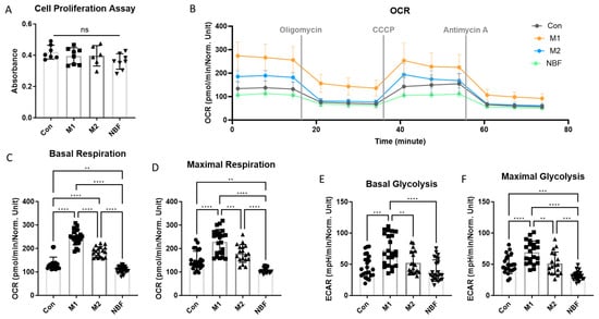 Seahorse Cell Mito Stress Test. (A). The comparison of the results of the Cell Proliferation Assay among Con, M1, M2, and NBF conditions. (B). The dynamic change in the oxygen consumption rate (OCR) of cells among Con, M1, M2, and NBF conditions. (C). The comparison of basal respiration rate among Con, M1, M2, and NBF conditions. (D). The comparison of maximal respiration rate among Con, M1, M2, and NBF conditions. (E). The comparison of basal glycolysis rate among Con, M1, M2, and NBF conditions. (F). The comparison of maximal glycolysis rate among Con, M1, M2, and NBF conditions (**: p < 0.01, ***: p < 0.001, ****: p < 0.0001).