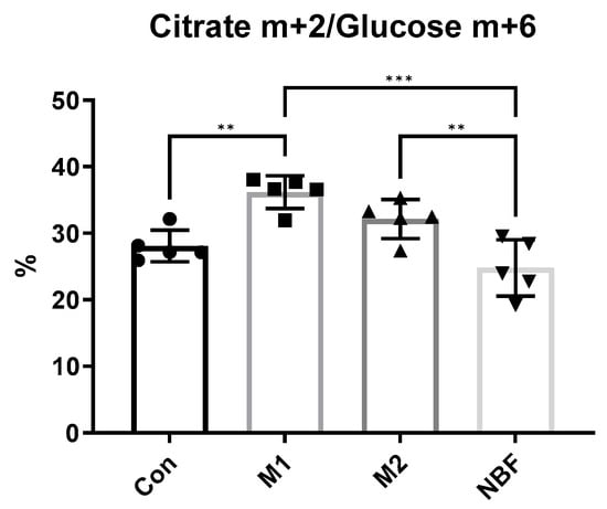 Metabolic Flux Analysis. The comparison of the percentages of citrate m+2 out of glucose m+6 in cells cultured in [U-13C6] glucose medium among Con, M1, M2, and NBF conditions (**: p < 0.01, ***: p < 0.001).