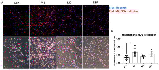 MitoSOXTM live cell staining. (A). The representative images of merged fluorescence channels (top panel; blue: Hoechst: red: MitoSOX indicator) and merged with bright field (bottom) of macrophages cultured in Con, M1, M2, and NBF conditions. (B). The comparison of the MitoSOXTM fluorescence intensity normalized to cell number among Con, M1, M2, and NBF conditions (*: p < 0.05).