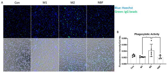 Phagocytosis Assay. (A). The representative live cell images of merged fluorescence channels (top panel; blue: Hoechst: green: FITC IgG beads) and merged with bright field (bottom) of macrophages cultured in Con, M1, M2, and NBF conditions. (B). The comparison of the FITC IgG fluorescence intensity normalized to cell number among Con, M1, M2, and NBF conditions (*: p < 0.05).